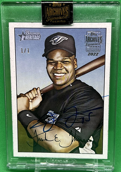 In terms of the contents, it’s pretty much more of the same with some new cards sprinkled in but overlap from previous years exists, which further waters down the already watered down Buyback and 1/1 concepts. I don’t mean to gripe about this but it’s amazing that with all the Frank Thomas cards issued in Topps products over the years, those responsible wouldn’t get more creative with which cards get added to this set from year to year. I’m surprised that parallels and inserts aren’t more welcomed. There are a few here and there but the overlap of base cards from issue to issue has been established. Think about it; you get excited to add a 1/1 of a card only to see that exact same card made as a 1/1 for this same set the following year. Talk about a fast way to diffuse excitement. In any case, here are images of the known Frank Thomas cards from 2022 Topps Archive Signature Series.